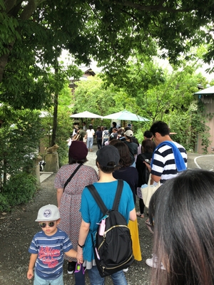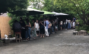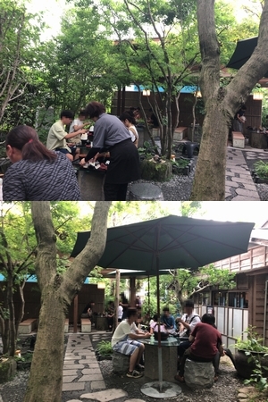 室内でも食べれる様ですが、案内されたのは屋 外でした。途中雨もポツポツと降って来ました (^_^;) 周りは緑に囲まれているので蚊が心配でしたが 色々な所に蚊取り線香が下げられていました。 |