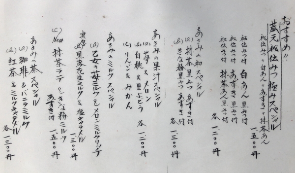![]() メニューです。本来単品でのメニューがあるみたいですが、この時期はコレだけみたいです。 かき氷なのに1000円超え!まっ手間ひまかけているので納得ですね(^^) 今回は1500円の秘伝みつ+白あん+あずき+抹茶あんを注文しました。リッチ(^^) |