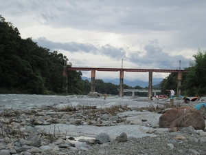 近くを流れる荒川に降りてみました。 鉄橋は秩父鉄道の上長瀞駅に続きます。 電車や貨物列車、SLも通ります。 結構水遊びしていた人、多かったです(^^) 水はひんやりと気持ち良かったです(^^) 川は、ラフティングや、カヌー、長瀞ライン下 りの木舟が通過していました(^^) |