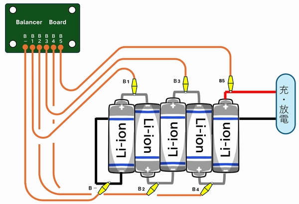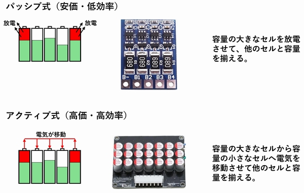 | 中華製の電動工具用バッテリーは、リチウムイオン電池(18650)が5本直列になっ ています。満充電にはなるものの、持ちは悪い感じで。 組電池について調べて見ると1本毎の容量にバラ付きがあるまま組み立てられたバ ッテリーは、正規の満充電にはならず全体容量として80%とかで満充電を認識して しまう様です。安価なバッテリーにはあるあるだそうです。 国産の有名メーカーのバッテリーは、1本1本を選別・試験して同程度の電池だけで 組み立てているそうで、そのコストが価格に反映されて高価なんですね。 とは言っても中華製電動工具には、国産バッテリーは付けられないので中華バッテ リーとして対策しないといけません。 まず、各電池の容量を揃える必要があります。その方法としてパッシブ方式とアク ティブ式があります。 |
