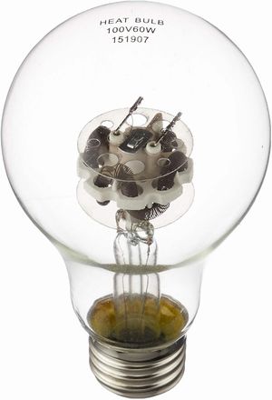 サーモスタットへの負荷を減らす目的と、実際 +15℃までの加温は不要かなと思いましたので 今回マルカンの60W保温球を初めて購入しまし た。これだと、室温+10℃まで加温出来るみた いです。 最初電球かと思っていました(;^_^A ガラスに糞が付くと割れることがあるみたいな ので、ちょっとした庇を付けてみました。 万一ガラスが割れても飛び散らないようにコー ティングがされています。 通電中はぼんやりと赤くなります。 |