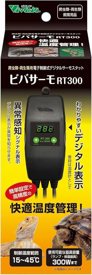 今回購入したサーモスタットはこちら。 ビバリア ビバサーモ RT300 鳥表記はありませんが、爬虫類とか良いなら似 た環境かなと、しかもデジタル表示仕様です。 常時センサで検知している温度が表示されヒー ターがONの状態表示もあります。 欠点は、ON/OFFのタイミングが早いことでリレ ー接点の劣化が早いのでは?と思ています。 このサーモスタットも300Wまでですので、問題 ありません。 |